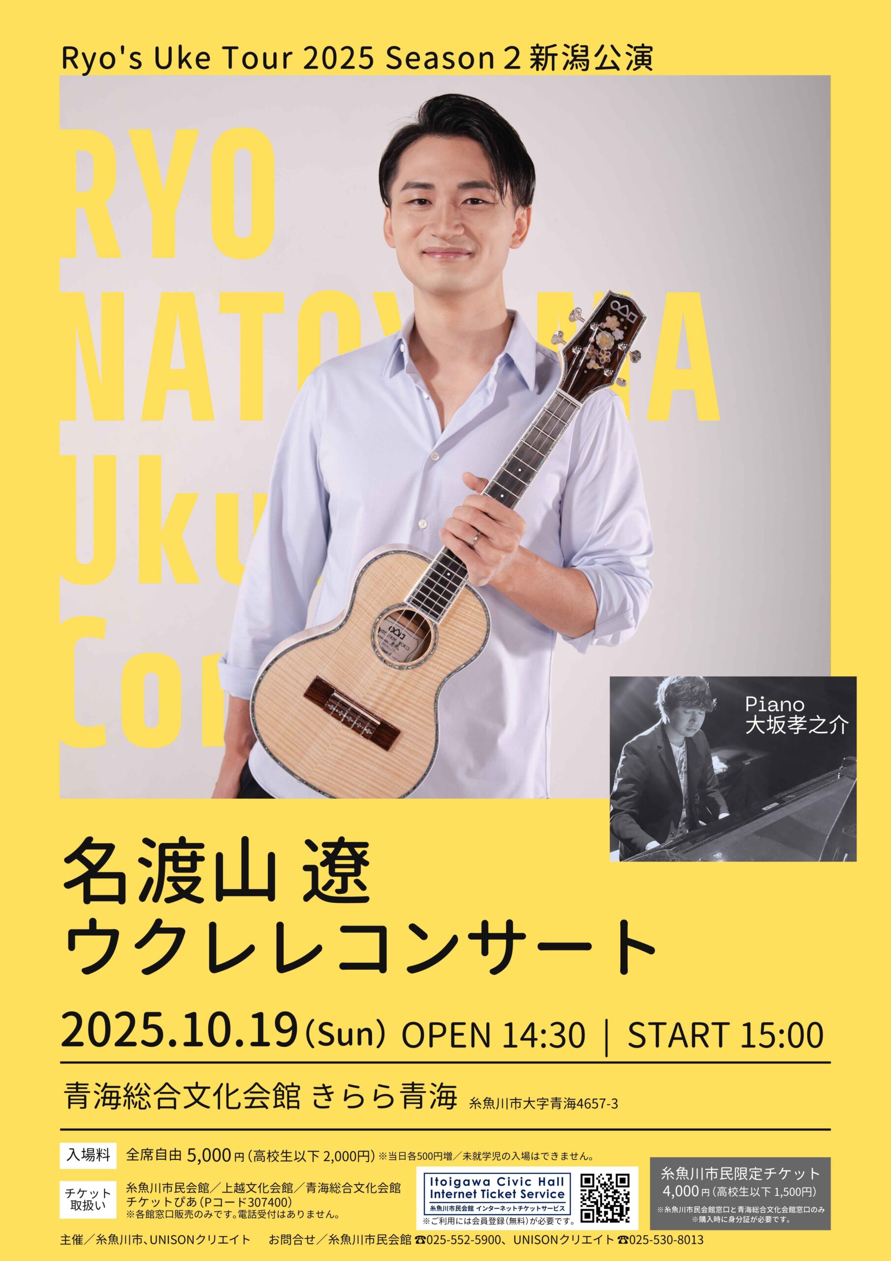 新潟県糸魚川市「青海総合文化会館 きらら青海」にて「Ryo’s Uke Tour 2025 Season2 新潟公演 名渡山遼 ウクレレコンサート」が開催されます!