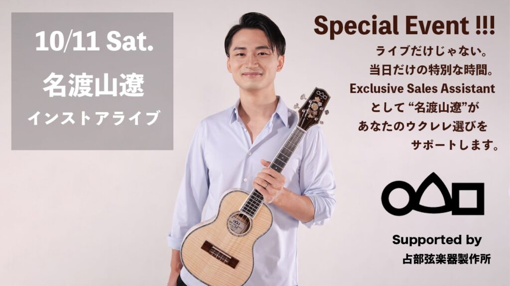 三木楽器200周年記念イベント「Music Realay」のひとつとして開催されるこのイベントは、ライブだけではなく、名渡山遼が店頭にてウクレレ選びのサポートもします。