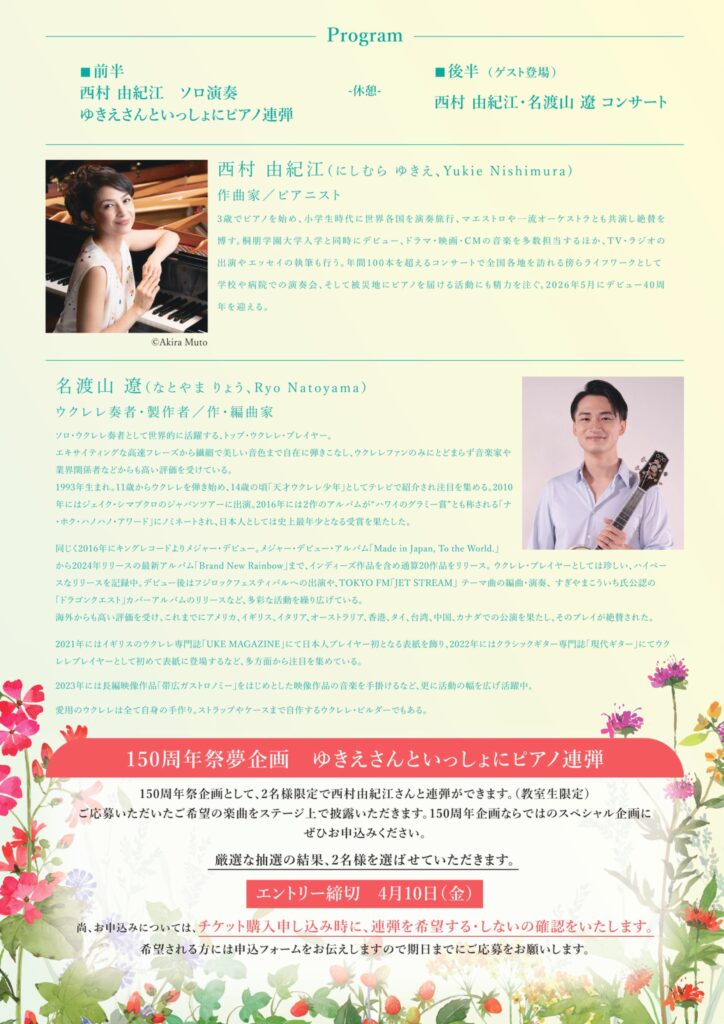 【ゲスト出演】スガナミ楽器創業150周年祭「西村由紀江コンサート」に、名渡山遼のゲスト出演が決定いたしました。
